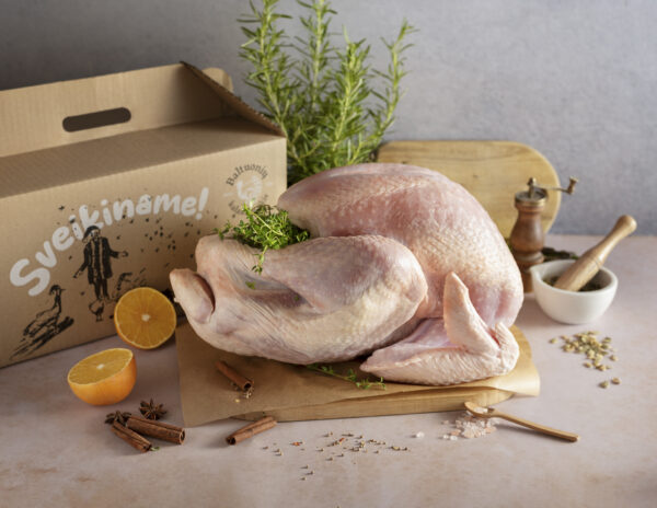 Kalakutas yra supakuotas į šaldymo kamerai tinkamą maišelį, jeigu nešate dovanai papildomai į krepšelį rekomenduojame pridėti ir šventinį įpakavimą: dežutę ar firminį medžiaginį maišelį. Kepimo maišeliai kartu su receptu bus pridėti atskiroje pakuotėje.